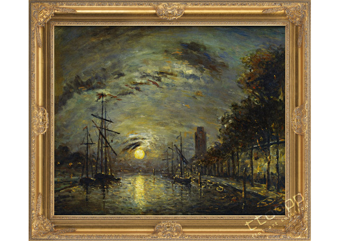 喬金德擅長描繪海景,受到17世紀荷蘭風景畫的影響,他在表現清澈的空氣氛圍及畫面構圖上極為講究。在【月光下的運河】中,喬金德以夜晚的港口為主題,明亮的月光投照在夜晚的運河上,河面的波動反射出瞬息萬變的璀璨華麗,令人著迷。