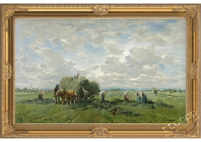 畫家朵瑪桑擅長風俗畫、風景畫與海景畫,其畫風與印象派接近。此作與法國巴比松畫派的創作相仿,天空中多變的雲彩,不但為畫面增加一份動感,也使整個場景更顯開闊壯觀;而在地上辛勤工作的人們與馬匹,也巧妙地融入於大自然美妙的律動中。