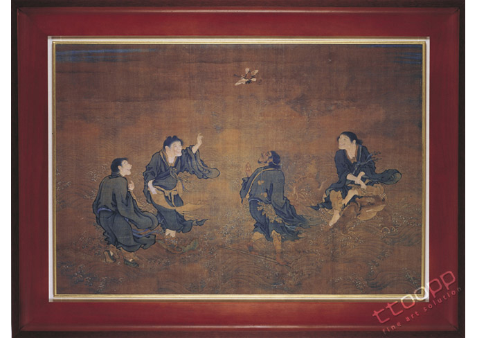 觀此圖於海濤中畫四踏波仙人,一仙持葫蘆,以鐵拐承足,似是李鐵拐 在四仙拱壽中,南極仙翁騎鶴歸去,四仙含笑仰首相送,不捨之情溢於言表,而四仙雖然其貌不揚,粗布藍衣,形如村夫,可臉上談笑自若的神采,與腳下的驚濤駭浪形成鮮明的對比,所用的也是極其普通的掃帚,拐扙,巴蕉葉,自是仙人不凡的體現。 畫面雖是一幅吉祥畫,但其用筆細膩,紋理之間透出作者的純熟的筆功,四仙形態逼真,似乎一步即可飄飄於卷面之外,呵呵的笑聲響不絕耳,其灑脫之情讓人倍生欽慕。 出處: 邱天元