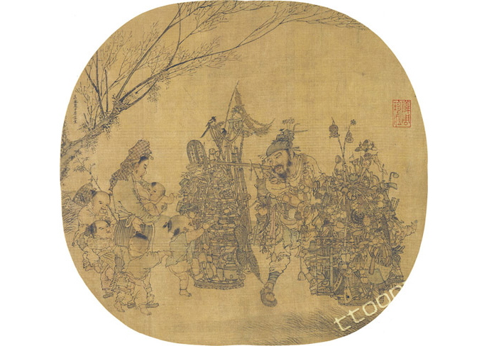 在宋代,有不少以貨郎圖為題材的作品,那身揹著各種日用品行走於城市近郊販賣貨物的職業,似乎也具體而微地說明城市發展起來以後,那溝通城市與農村的人物,身上掛滿日用品百貨,把城市的新奇生產帶到偏遠的農村,也同時帶去了城市的種種傳聞,使城市市民的生活變成農民嚮往的對象。 出處: 邱天元