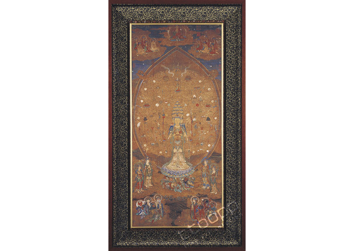 | | | | | | | 在此畫中作者以華麗的色彩,飄逸的線條,細膩的筆觸淋漓盡致的描繪出在霞光流彩中,諸神供奉,千手千眼觀世音慈善莊重神聖而不可侵犯的威儀,足以令世上一切邪惡在她面前手無足措,無所遁形。 | |